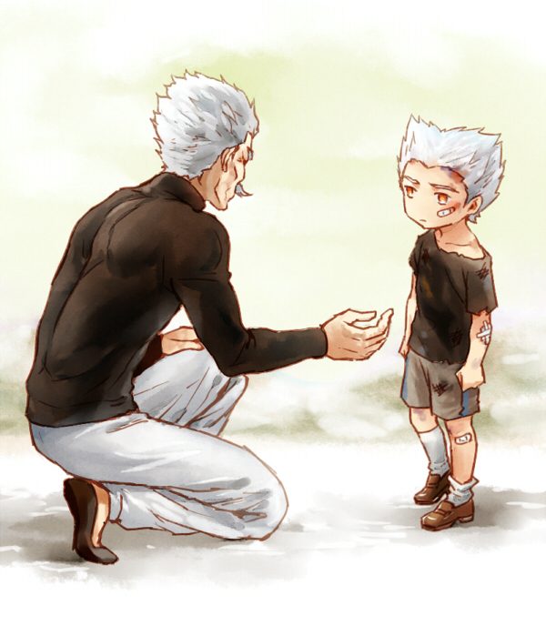 Khi còn là một đứa trẻ, Garou không được ưa chuộng và là một cậu bé trầm tính. Ở trường, trong khi cậu đang đọc sách, một đứa bé khá nổi tiếng tên là Tacchan đã đến gần cậu và muốn chơi trò “Anh hùng đánh Quái vật” với cậu. Trong đó, Tacchan tự tuyên bố Garou là Quái vật còn mình vào vai Anh hùng. Tacchan cố gắng làm Garou bị thương nhưng Garou đã né tránh khiến Tacchan bị mất đà và té ngã. Garou xin lỗi còn Tacchan cau có hỏi: “Mày đang làm gì vậy? Mày là quái vật, quái vật thì phải bị đánh!” và sau đó những đứa trẻ khác nghe lệnh Tacchan giữ chặt Garou để Tacchan đá vào mặt cậu.